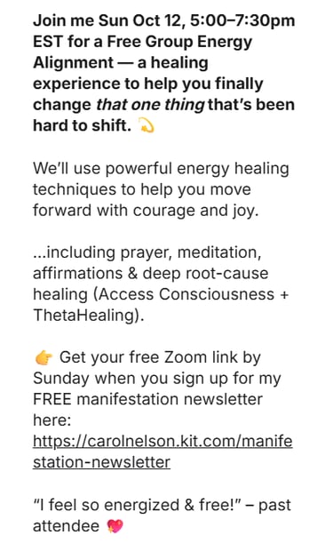 "She (Carol) helped me clear major energies. Incredible…a humongous win!" Amanda, CA